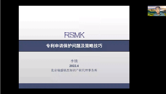 李绩老师简单介绍了北京瑞盛铭杰知识产权代理事务所的基本情况、组织构架、团队介绍、服务范围等,随后围绕“专利申请保护问题及策略技巧”进行了详细讲解,主要从维权案例看专利保护撰写、专利种类及申请流程、决定发明专利授权的三性问题和中国知识产权环境和政策趋势做了细致的介绍。线上观众积极参与回答并提出相关问题,对知识产权的申请和保护产生浓厚的兴趣,李绩老师对在场观众提出的问题给予专业细致的解答,现场氛围非常热烈,在场观众收获颇丰。