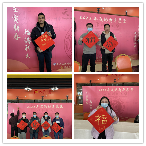 中午11时的新食堂二楼热闹非凡,在学校组织的春节年夜饭的现场,我院二十四名留校同学写春联、包饺子,在欢声笑语中感受中国年俗,活动现场张灯结彩,年味十足。写毛笔字对同学们来说略有难度,特别是留学生们,但大家都兴趣盎然。18级斯里兰卡留学生帝喧在现场老师的指导下学习握笔、踊跃练习、认真临摹,一幅独具特色的虎年快乐新鲜出炉,满是年味的传统民俗让学生们体验到中国传统节日的魅力,更驱散了浓浓乡愁。