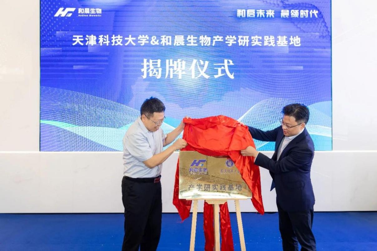 党委副书记、校长路福平,和晨生物董事长杨青共同为“天科大——和晨生物 产学研实践基地”揭牌。