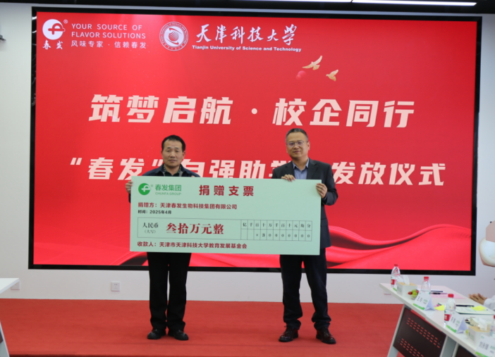 食品科学与工程学院党委副书记聂慎德代表学院向天津春发生物科技集团有限公司一直以来对学院各项工作的大力支持表达了感谢,希望校企双方能够巩固并深化现有的良好合作关系,在奖助育人、科研攻关、就业创业等多个方面开展全方位、深层次的探索,形成校企合力,共同培养更多专业型食品人才,也让更多受到资助的学生反哺社会、奉献社会。