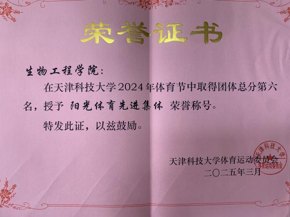 2024年体育节中通过全院师生的共同努力,凭借在多个项目中的优异成绩,获得“阳光体育先进集体”荣誉称号。在天津市国家学生体质健康标准测试抽测中高度重视,积极准备,获得“突出贡献集体”荣誉称号。这些荣誉称号是学院体育育人工作的生动实践,学院将进一步立足教育抓体育,让体育育人释放出更多活力与能量,让青年学生在体育锻炼中享受乐趣、增强体质、健全人格、锻炼意志,成为德智体美劳全面发展的社会主义建设者和接班人。