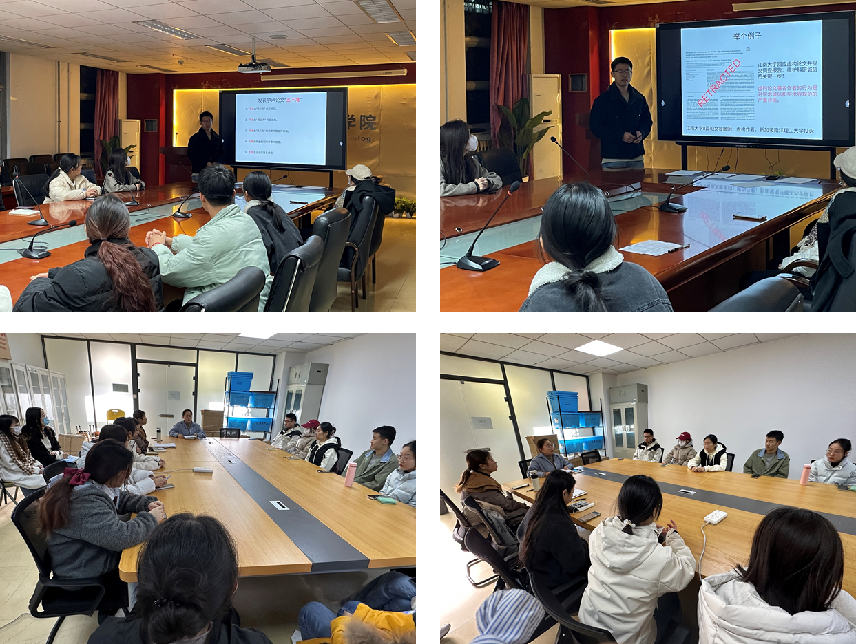 为优化研究生学术诚信环境,切实加强科研作风和学风建设,引导全体师生系好学术生涯“第一粒扣子”,10月27日-11月24日在学院内组织开展多场学术诚信和学术道德相关文件的集体学习活动。通过以研究生班级、实验室团队、研究生党支部为主体,组织研究生围绕《2023年研究生科学道德和学风建设宣讲教育文件选编》与《关于进一步弘扬科学家精神加强作风和学风建设的意见》等文件进行学习和研讨,强化发挥导师对研究生科学道德和科研诚信的教育引导作用,不断深化科学家精神入脑入心。