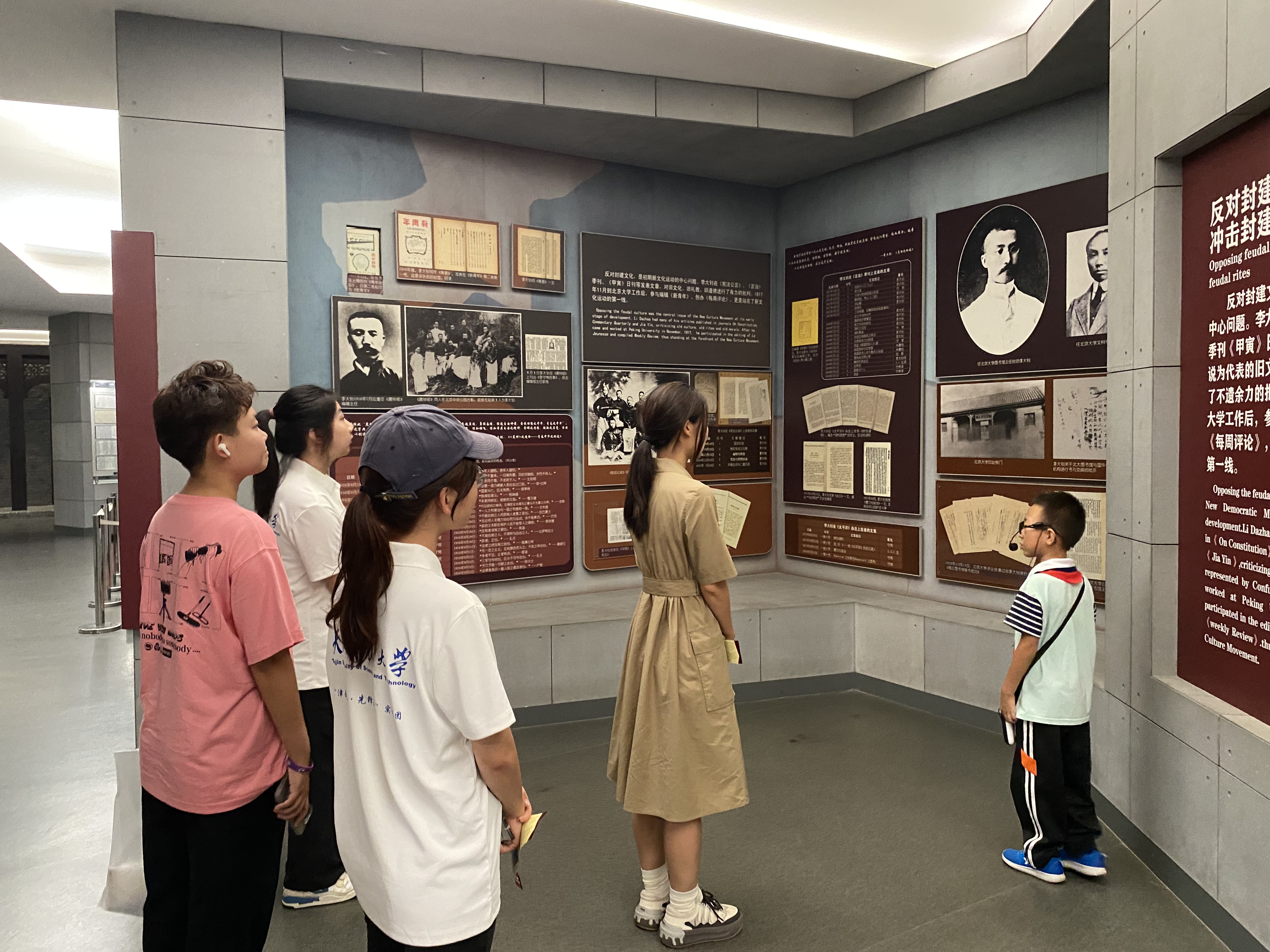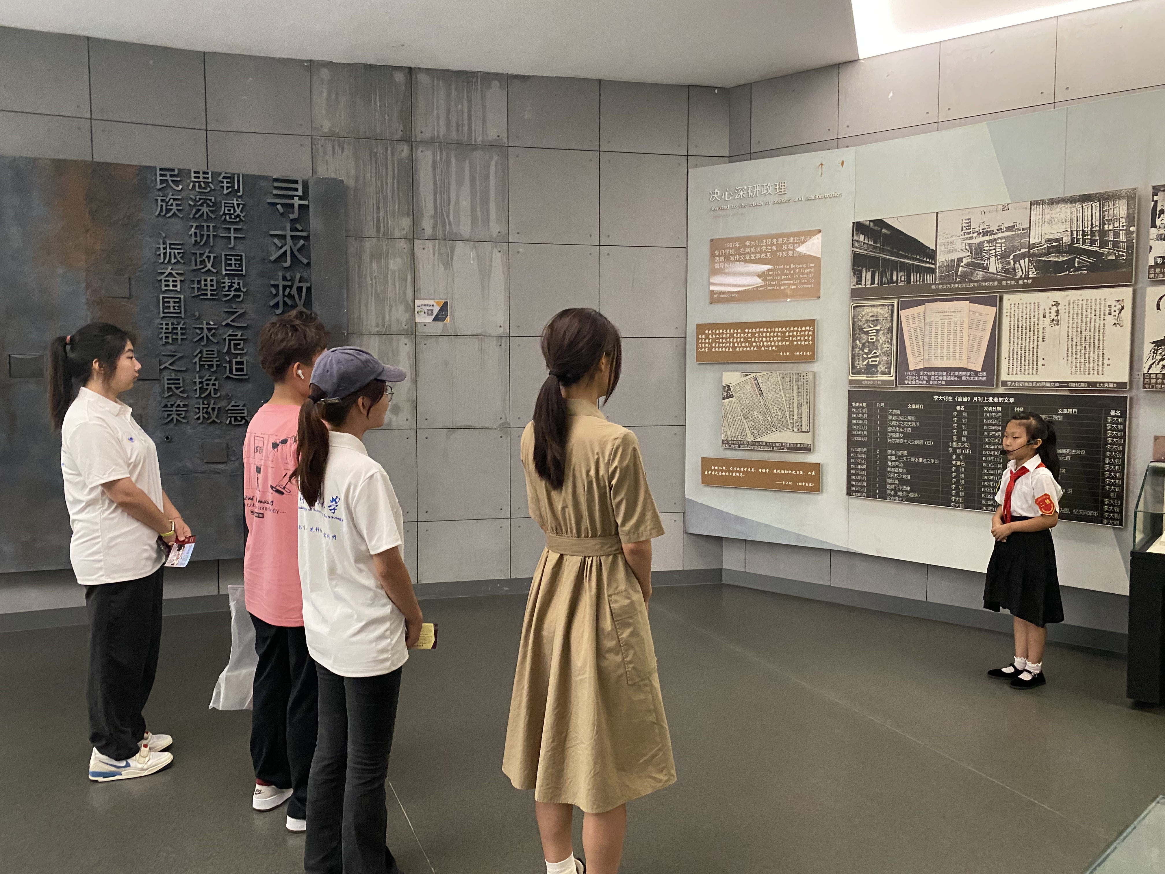 离开故居,实践团抵达李大钊纪念馆,一群身着校服的小讲解员主动上前,为大家讲述李大钊先生的生平事迹。他们分工协作,从“寻求救国真理”的青年求索之路,到成为“中国最早的马克思主义传播者”的坚定选择,再到参与创建中国共产党、领导工人运动等,小讲解员们用稚嫩却坚定的声音,传递着对先辈的崇敬之情。这一场跨越年龄的红色对话,让实践团成员深受触动。