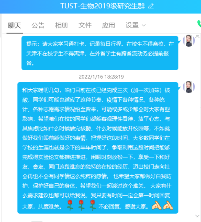 全体辅导员自1月8日迅速调整至“战时”工作模式,对于各项指令通知,学生工作队伍确保第一时间落实,为抗“疫”赢得时间。自疫情发生以来,学院信息日报告制度为学院党委掌握学生一手信息、为辅导员有效工作提供了精准实施工作的必要基础数据,精准掌握每日学生在校、在津、在京、不在津和京、核酸检测人数,发热数、隔离数、健康码变色数,并随着多点疫情反复,新增天津、北京、其他省份封控区、管控区、防范区学生数。此外,辅导员任艳萍、李璐、申莉、周丽媛、王小楠、景文杰、吕晓彤主动报名学院疫情防控突击队,在数次科大核酸大筛中负责学生核酸检测组织工作,辅导员田凯、赵华民义无反顾投入到当地社区疫情防控志愿服务中,生物学工队伍全体奋战在“疫”线,守学生安定,护一方平安。