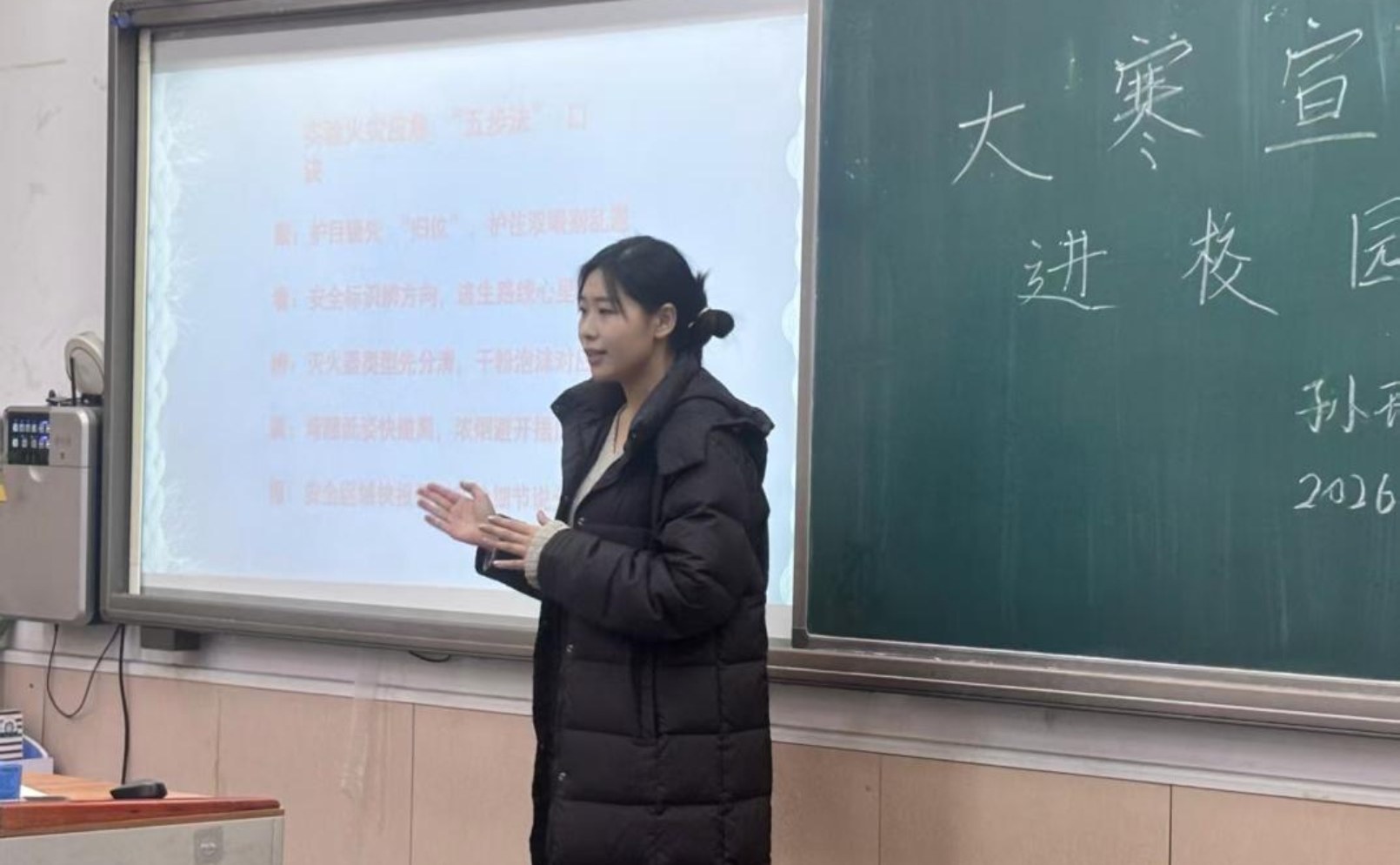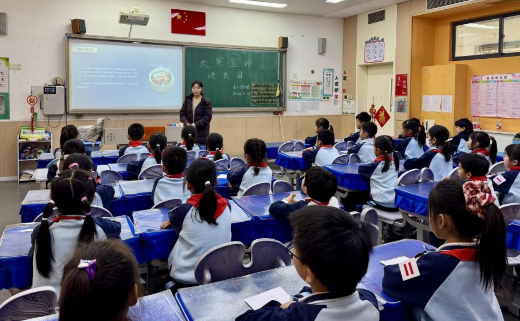 研究生、经开区蓝天救援队志愿者孙珊珊,开场引用《风俗通义》所言“腊者,接也”,说道“大寒既是旧岁的收官,也是新春的序曲”,为青少年们奠定了大寒的初步印象。随后通过播放大寒动画科普短片,将节气时间、气候特点以及节气习俗款款展示在青少年们的眼前,动画科普短片迅速吸引了孩子们的目光并顺理成章的让小朋友们对大寒有了简单了解。科普短片播放完毕之后,进入简单的互动环节,孙珊珊通过“大寒一般在每年的几月几日?”、“大寒节气作为最后一个节气有什么特点?”等问题调动起了青少年们的积极性,加深了青少年们对于大寒知识的印象。
