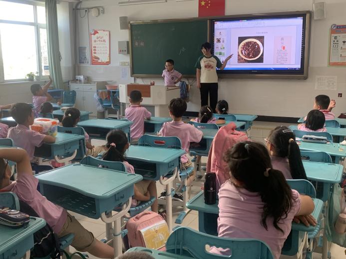 双减课后服务志愿者2022级本科生张燕青将生物学知识与河南传统食品酱豆子的制作结合起来,并融入农业知识,向同学们讲了大豆的种植和大豆的营养价值,介绍了酱豆子的制作过程,在其中穿插了发酵的知识,并向同学们讲解了可食用的菌类与有害霉菌的不同。