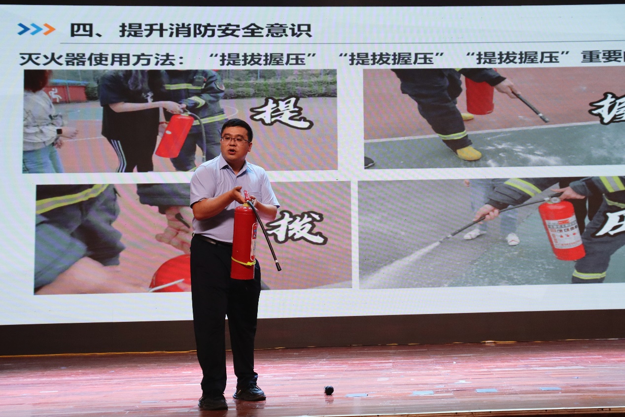 学院邀请了保卫处王悦科长带来一场生动详实的消防安全教育讲座。他结合高校实验室火灾案例,深入剖析火灾发生的原因及危害,详细讲解了灭火器、消防栓等消防设施的使用方法以及火灾预防措施。保卫处孙家平老师现场示范了“过滤式消防自救呼吸器”和灭火毯的使用方法。两位老师通过现场演示与互动问答,强化了同学们的安全意识,直观掌握火灾逃生技巧,有效提升了大家应对突发火情的能力。