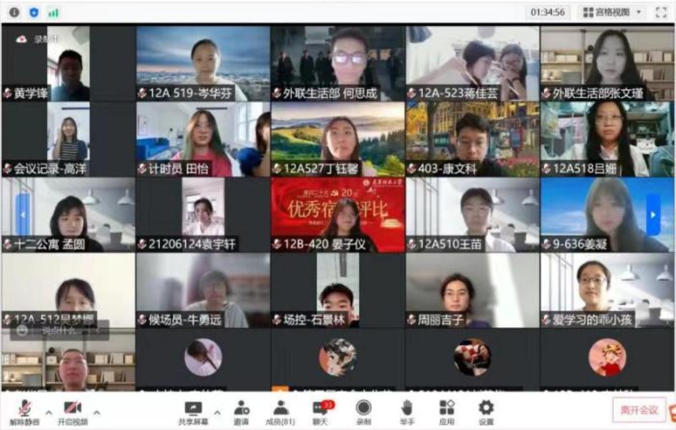 本次活动分为优秀宿舍评比和优秀宿舍长(网格员)评比两部分组成。在优秀宿舍评比环节中,各宿舍主讲人展示PPT,介绍宿舍环境和宿舍同学学习工作情况,并与观众分享了宿舍围绕“献礼二十大”、“百年团史”、“红色文化”、“科技创新”、“筑梦冬奥”、“绿色健康”、“文艺青春”、“劳动最光荣”等主题进行的文化布置。在优秀宿舍长(网格员)评比环节中,宿舍长们分别从个人介绍,宿舍工作,未来展望等方面介绍了自己,宿舍长们以身作则,不仅带动宿舍成员们勤勉刻苦,助力宿舍成员多方面发展,也团结同学,构建了良好的学习生活环境,赢得了评委老师的一致赞赏。
