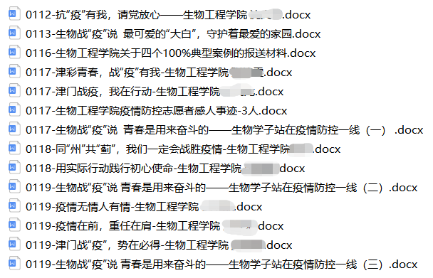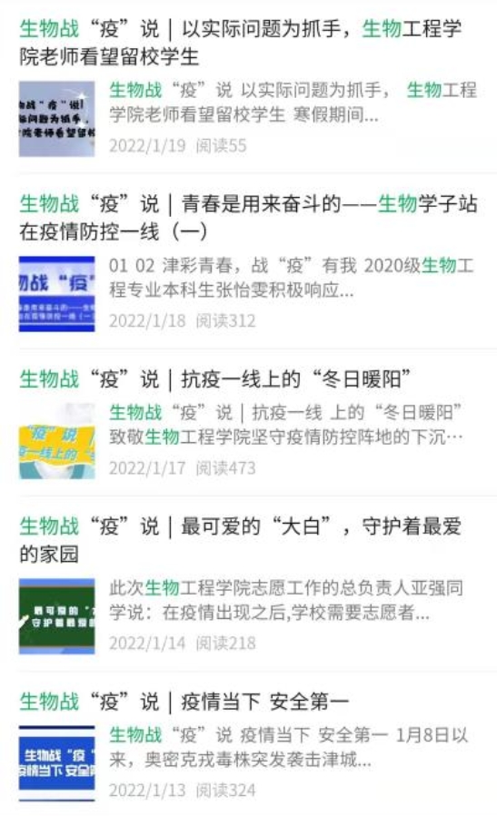 全体辅导员自1月8日迅速调整至“战时”工作模式,对于各项指令通知,学生工作队伍确保第一时间落实,为抗“疫”赢得时间。自疫情发生以来,学院信息日报告制度为学院党委掌握学生一手信息、为辅导员有效工作提供了精准实施工作的必要基础数据,精准掌握每日学生在校、在津、在京、不在津和京、核酸检测人数,发热数、隔离数、健康码变色数,并随着多点疫情反复,新增天津、北京、其他省份封控区、管控区、防范区学生数。此外,辅导员任艳萍、李璐、申莉、周丽媛、王小楠、景文杰、吕晓彤主动报名学院疫情防控突击队,在数次科大核酸大筛中负责学生核酸检测组织工作,辅导员田凯、赵华民义无反顾投入到当地社区疫情防控志愿服务中,生物学工队伍全体奋战在“疫”线,守学生安定,护一方平安。
