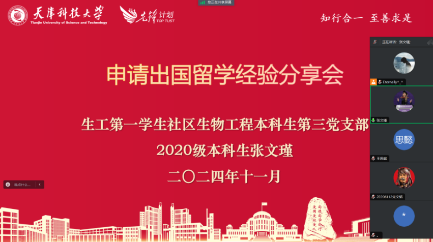 于11月19日通过腾讯会议举办出国留学经验分享交流会。交流会邀请了生工第一学生社区生物工程本科生第三党支部党员、目前就读于新加坡国立大学的2020级本科生张文瑾进行宣讲,色情导航