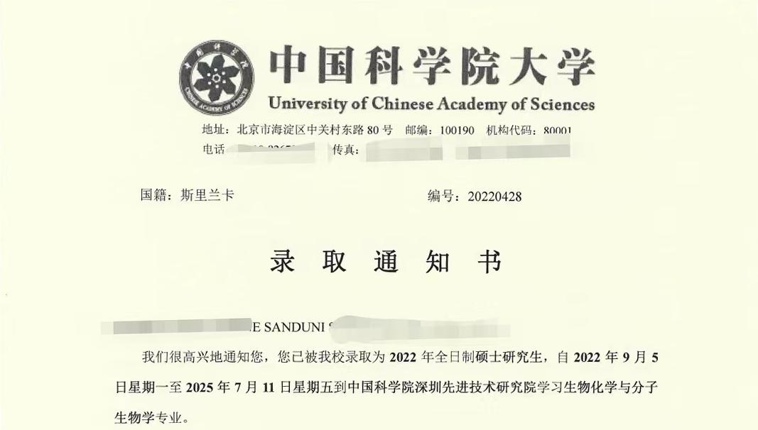 2018级本科留学生SANDUNI被中国科学院大学 深圳先进技术研究院 录取攻读生物化学与分子生物学硕士学位。这是继我校色情导航